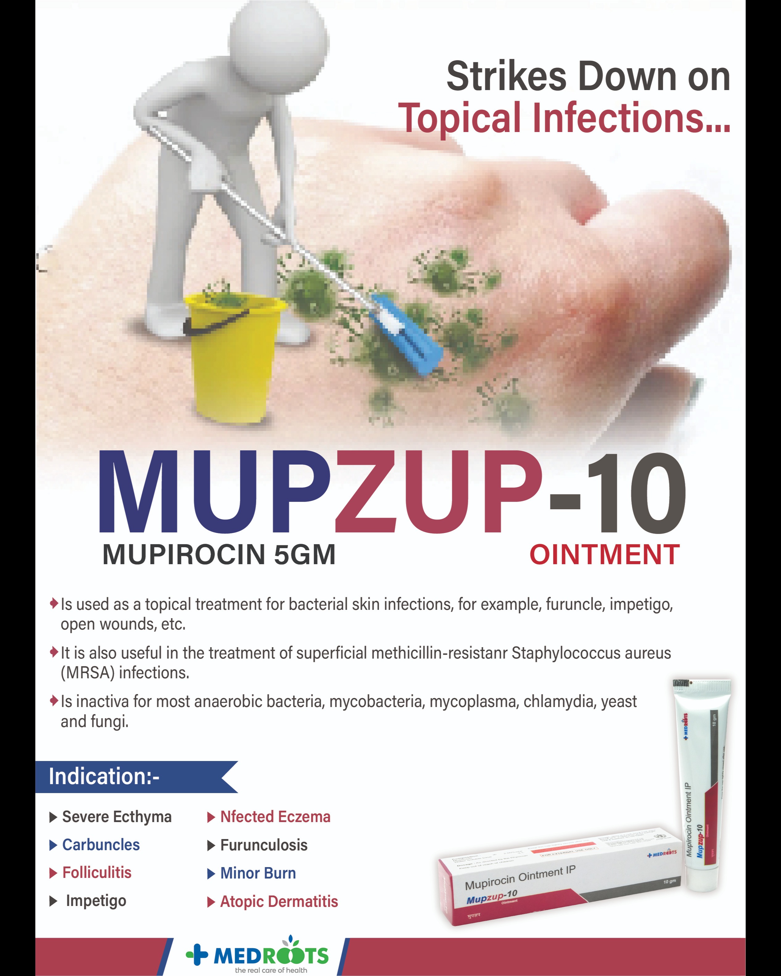 MUPZUP (Mupirocin Ointment) - Advanced Topical Antibiotic Solution Product Overview MUPZUP is a premium topical antibiotic ointment containing Mupirocin, specifically formulated for effective treatment of bacterial skin infections. Available in convenient 5gm and 10gm tubes, MUPZUP offers targeted antimicrobial therapy for healthcare professionals and patients across India. Key Product Information Active Ingredient: Mupirocin 2% w/w Available Sizes: 5gm & 10gm tubes Formulation: Topical ointment Coverage: Pan India distribution through PCD network Therapeutic Class: Topical antibiotic Clinical Applications & Indications Primary Indications MUPZUP Mupirocin ointment is clinically indicated for: Impetigo: Superficial bacterial skin infections Secondary infected eczema: Treatment of infected dermatitis Folliculitis: Hair follicle bacterial infections Minor skin wounds: Prevention and treatment of bacterial contamination Nasal decolonization: Elimination of Staphylococcus aureus carriage Bacterial Coverage Highly effective against: Staphylococcus aureus (including MRSA strains) Streptococcus pyogenes Beta-hemolytic streptococci Other gram-positive cocci Unique Selling Propositions (USPs) Advanced Formulation Benefits Rapid Action: Quick bacterial elimination within 24-48 hours Minimal Resistance: Low resistance development compared to other topical antibiotics Enhanced Penetration: Superior skin penetration for deeper infection control Safe Profile: Minimal systemic absorption ensures safety Broad Spectrum: Effective against multiple bacterial pathogens Convenient Packaging 5gm Tube: Ideal for minor infections and travel convenience 10gm Tube: Perfect for extended treatment courses and larger affected areas User-friendly: Easy application with precise dosing Mechanism of Action Mupirocin in MUPZUP works by inhibiting bacterial protein synthesis through binding to bacterial isoleucyl-tRNA synthetase. This unique mechanism prevents development of cross-resistance with other antibiotic classes, making it highly effective against resistant bacterial strains. Dosage & Administration Application Guidelines Frequency: Apply 2-3 times daily Duration: 5-10 days as per physician's advice Method: Clean affected area, apply thin layer of MUPZUP ointment Coverage: Extend slightly beyond infected area Special Instructions Use only as directed by healthcare professional Complete full course even if symptoms improve Avoid contact with eyes and mucous membranes Wash hands before and after application Safety Profile & Contraindications Safety Advantages Minimal systemic absorption Low incidence of adverse reactions Suitable for pediatric use Compatible with other topical medications Contraindications Hypersensitivity to mupirocin or excipients Avoid in patients with severe renal impairment (for extensive use) PCD Partnership Opportunities Business Benefits for PCD Partners High Demand Product: Essential antibiotic with consistent market demand Dual Pack Options: 5gm and 10gm variants cater to different market segments Pan India Coverage: Nationwide distribution rights available Competitive Margins: Attractive profit margins for distributors Marketing Support: Comprehensive promotional materials provided Target Markets Primary Care Physicians: First-line treatment for skin infections Dermatologists: Specialized skin infection management Pediatricians: Safe option for children's skin conditions General Practitioners: Versatile antibiotic for common infections Retail Pharmacies: High-turnover OTC-like demand Market Positioning Competitive Advantages MUPZUP stands out in the crowded topical antibiotic market through: Superior Efficacy: Clinically proven bacterial eradication Resistance Profile: Maintains effectiveness against resistant strains Flexible Sizing: Two convenient pack sizes for different needs Quality Assurance: Manufactured under strict GMP guidelines Affordability: Competitive pricing for broader market access Target Demographics Age Groups: All age groups including pediatric patients Economic Segments: Middle to upper-middle class with healthcare awareness Geographic Focus: Urban and semi-urban areas with better healthcare infrastructure Healthcare Settings: Clinics, hospitals, and retail pharmacies Regulatory Compliance Drug Controller General of India (DCGI) approved Good Manufacturing Practices (GMP) certified facility WHO-GMP standards compliance Pharmacovigilance systems in place Quality assurance protocols followed Storage & Handling Store at room temperature (15-30°C) Protect from light and moisture Keep out of reach of children Do not freeze Use within expiry date mentioned on pack Healthcare Professional Resources Clinical Evidence Extensive clinical studies demonstrate MUPZUP's superiority in: Faster healing times compared to other topical antibiotics Higher bacterial eradication rates Lower recurrence rates Better patient compliance due to convenient application Educational Support We provide healthcare professionals with: Clinical literature and research papers Patient counseling materials Dosage calculation charts Treatment protocol guidelines Contact Information for PCD Inquiries For PCD Partnership Opportunities: SEO Keywords Integration This content is optimized for search terms including: Mupirocin ointment, MUPZUP, topical antibiotic, skin infection treatment, bacterial skin infections, PCD pharma, pharmaceutical distribution, antibiotic ointment India, impetigo treatment, MRSA treatment, dermatology products, and healthcare distribution opportunities.